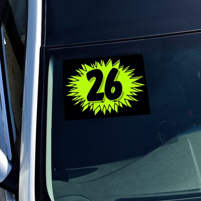 - Our “Sign Painter” White die-cut adhesive windshield number.